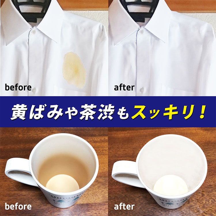 色柄ものにも安心で、茶渋・醤油・黄ばみ・血液などの汚れも漂白・消臭・除菌します。