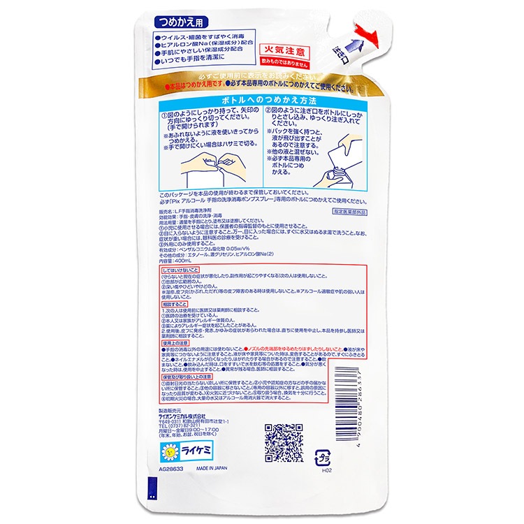 Pix アルコール 手指の洗浄消毒ポンプスプレー つめかえ用 400mL