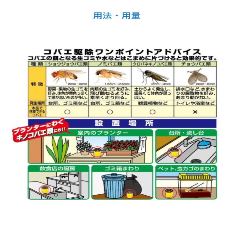 ショウジョウバエ、ノミバエ、キノコバエに対して効果があります。