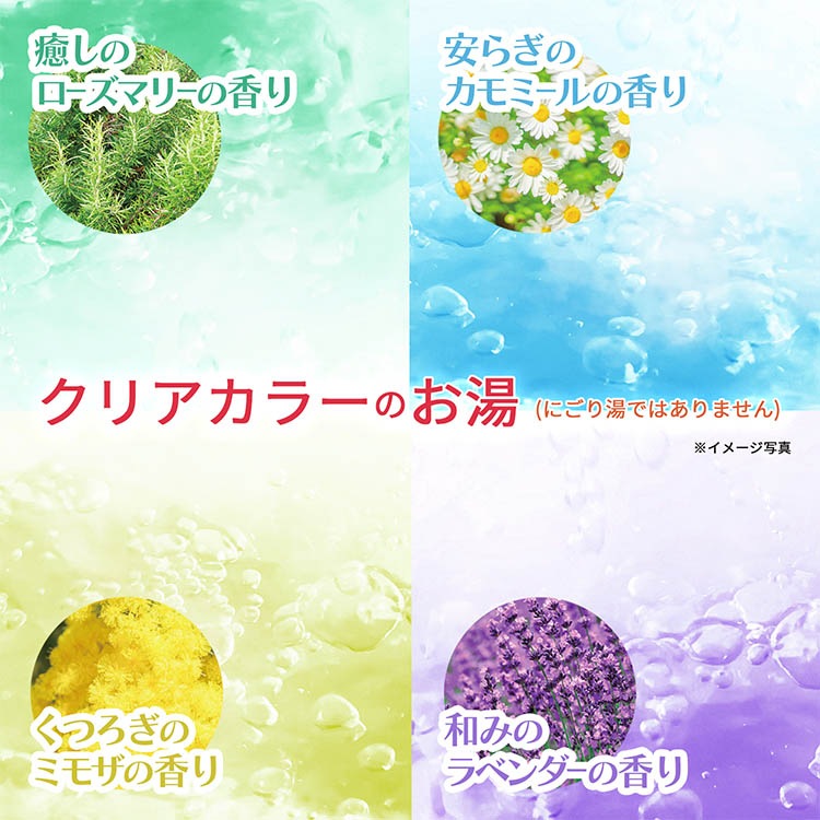 ●4種類のカラフルな色のお湯とほのかな香りで、身体も心もリラックス感につつまれます。