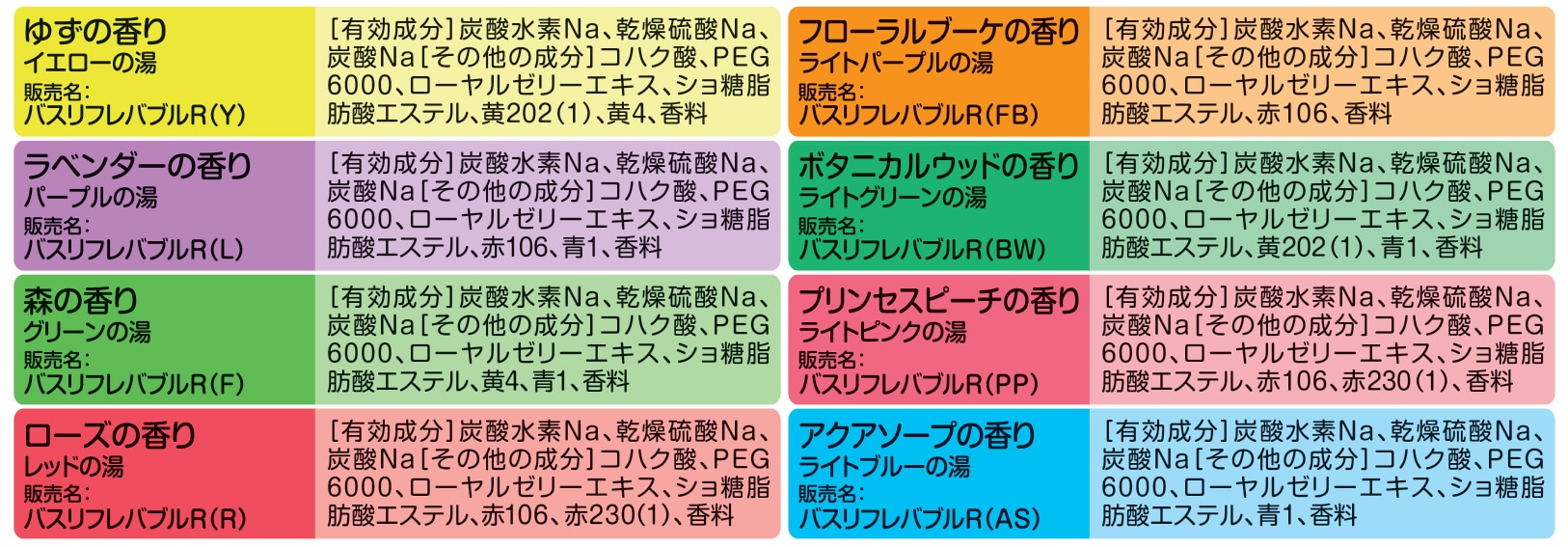 ●8種類のカラフルな色のお湯とほのかな香りで、身体も心もリラックス感につつまれます。