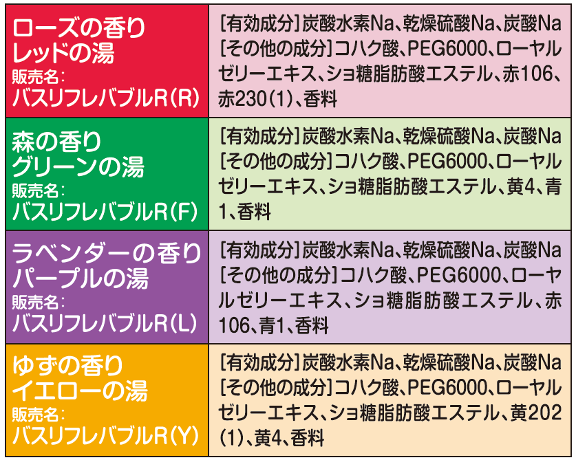 バスリフレ薬用発泡入浴剤のお湯は全部で4種類